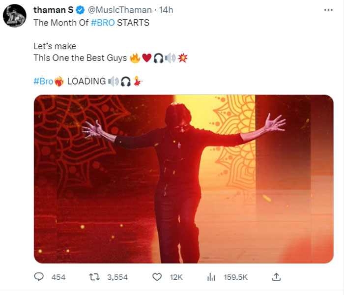 Thaman signals BRO month. Pawan Kalyan, Sai Dharam Tej's BRO is racing for a spectacular release on 28 July 2023. The film directed by Samuthirakhani is the remake of the Tamil film Vinodhaya Sitham. The film's promotions, first look, and the t...